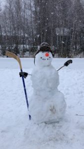Der Samstag hat mies angefangen, weil es einen Grad zu warm war, und wir eher so Schneeregen hatten, der auch sofort geschmolzen ist. Am Nachmittag wurde es aber kälter und es hat angefangen, richtig heftig zu schneien. Hier in Kanada spielen wir gerne ein Spiel, das nennt sich: Wo zum Teufel ist die Straße?! Wenn viel Schnee fällt und der Schneepflug noch nicht da war sieht man absolut gar nichts. Gestern sind wir also rausgegangen und haben erstmal eine Schneeballschlacht gemacht und haben dann einen Schneemann gebaut. Weil wir keine Möhren hatten