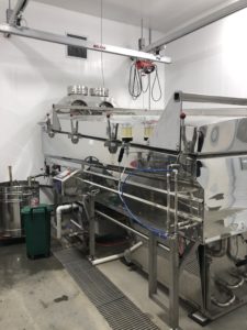 Nachdem das Ahornwasser in der Produktion gesammelt wurde, wird es eingedampft. Zwar kann man das Ahornwasser einfach so trinken (kann ich sehr empfehlen, es schmeckt nur leicht süß), aber es hat wenig Ähnlichkeit mit dem Ahornsirup aus der Dose. Der Sirup wird eingedampft gefiltert, was in dieser sehr komplizierten Maschine passiert. Generell wird sehr viel Wasser verdampft, sodass nur noch der dickflüssige Sirup zurückbleibt. Wenn es gut läuft, dann kann man aus 40 Litern Ahornwasser 1 Liter Sirup gewinnen, was den hohen Preis erklärt. Gerade am Frühlingsanfang ist das Wasser noch nicht so süß, sodass man oft mehr braucht (gestern war das Verhältnis 80L Ahornwasser -> 1L Sirup). Der Sirup wird in den meisten Fällen in große Fässer gefüllt und an Großbetriebe weiterverkauft. Auf der Erabliere auf der ich war, wird der fertige Sirup vor allem an Großbetriebe weiterverkauft, und an speziellen Tagen wird der Ahornsirup in Dosen umgefüllt, um ihn an Kunden weiterzuverkaufen. Am Frühlingsanfang kann man seine Bestellung aufgeben, damit keine Dosen im Überfluss produziert werden. Meine Gastfamilie hatte eine Gallone (4L) für das gesamte Jahr bestellt, und wir essen bestimmt noch weniger Ahornsirup als der Normalverbaucher.